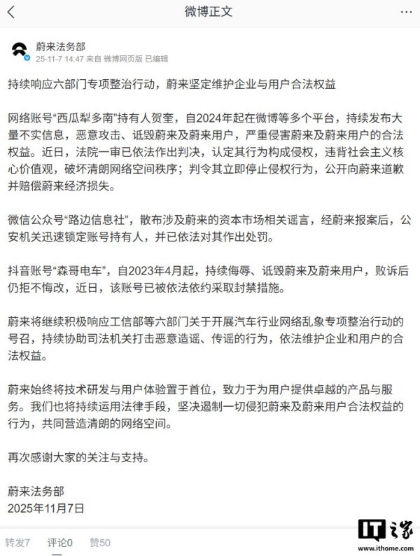 IT之家 11 月 7 日音尘,蔚来法务部当天通报了最新的维权阐扬。蔚来法务部称,合手续反应六部门专项整治当作,蔚来执意养息企业与用户正当职权。IT之家附原文如下: 合手续反应六部门专项整治当作,蔚来执意养息企业与用户正当职权 集中账号“西瓜犁多南”合手有东说念主贺奎,自 2024 年起在微博等多个平台,合手续发布大量虚伪信息,坏心袭击、乱骂蔚来及蔚来用户,严重侵害蔚来及蔚来用户的正当职权。近日,法院一审已照章作出判决,认定其当作组成侵权,顽抗社会观点中枢价值不雅,碎裂明朗集中空间秩序;判令其.